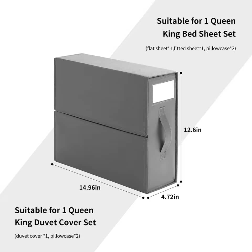 نظمدهنده چند منظوره ملحفه — نظمدهندهها و انبارهای تاشوی ملحفه میتوانند ملحفه، روبالشی، روکش لحاف، روکش لحاف، دامن میز ضیافت، روکش مبل، پرده تخت و سایر وسایل را در خود جای دهند. شکل مکعبی، مناسب برای نگهداری در کشوها، کمدها، گنجهها، قفسههای انباری، کابینتهای انباری و جاهای دیگر، زیبا و شیک.